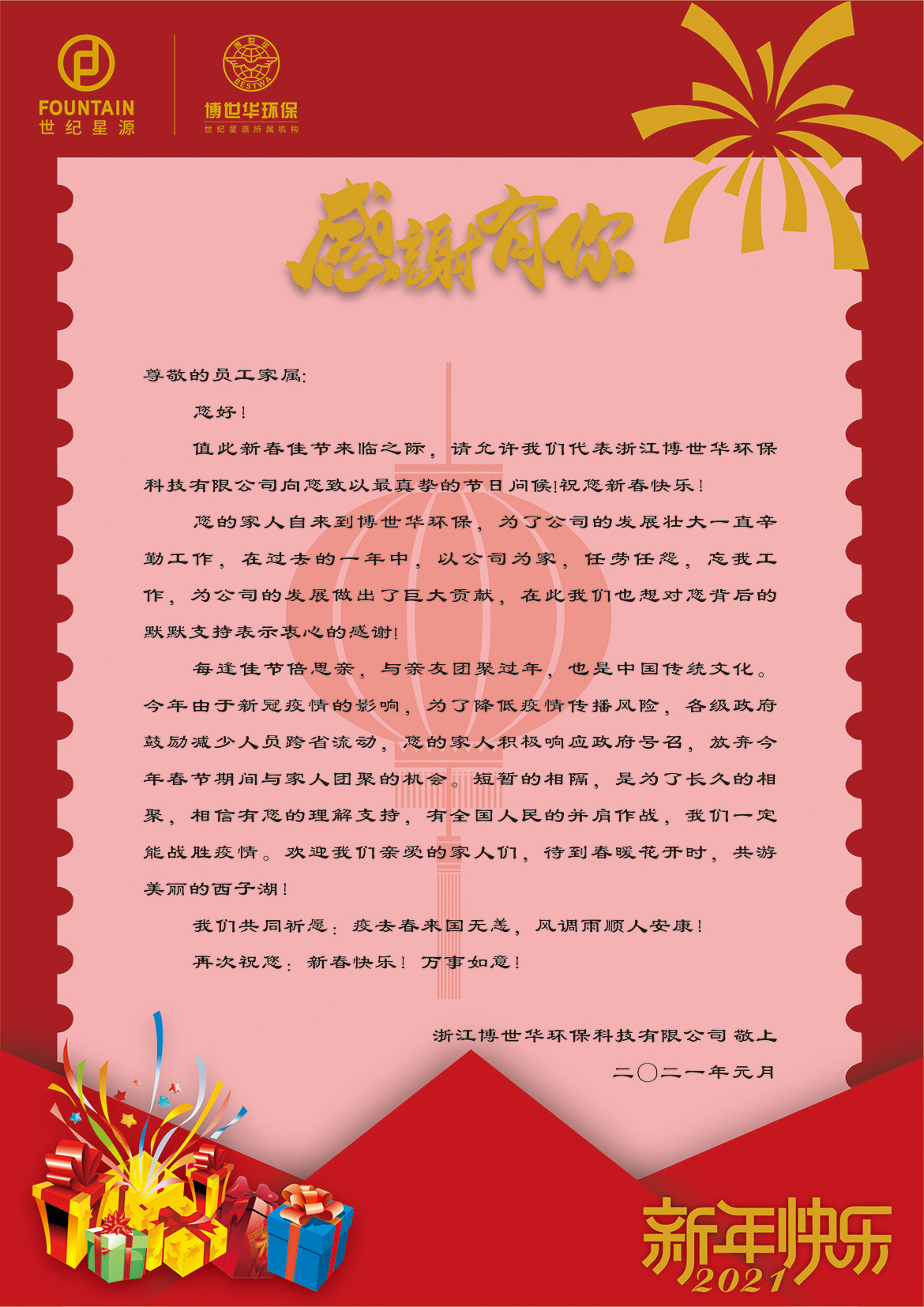 辛丑年春節(jié)將至,由于新冠疫情的影響,為了降低疫情傳播風險,各級政府鼓勵減少人員跨省流動。為了更好配合疫情防控工作,浙江博世華環(huán)保科技有限公司積極響應國家號召,在認真做好疫情防控部署的同時,開展了一系列豐富多樣的關愛活動,鼓勵支持員工春節(jié)期間留杭、留項目當?shù)剡^節(jié),讓員工感受到“家”的溫暖: