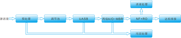 通過預處理去除滲濾液中大量的懸浮物及二價離子,然后進入UASB池。利用厭氧反應削減有機負荷,然后利用兩級A/O工藝的強化脫氮能力,保證總氮達標出水,同時進一步降低有機污染物濃度。A/O出水經(jīng)超濾系統(tǒng)(UF)截留有機污泥,再通過膜深度處理系統(tǒng)(NF+RO),確保出水水質達標排放。